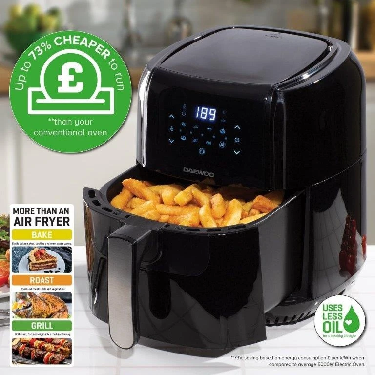 Thanks to its large 5.5 litre capacity the Daewoo Air Fryer allows you to cook a variety of healthy family meals with no fuss, and very little mess. Thanks to it’s powerful 1400 watts, and Rapid Air Circulation, this low fat family air fryer can reach between 80-200c, giving a thorough and even cook.Â