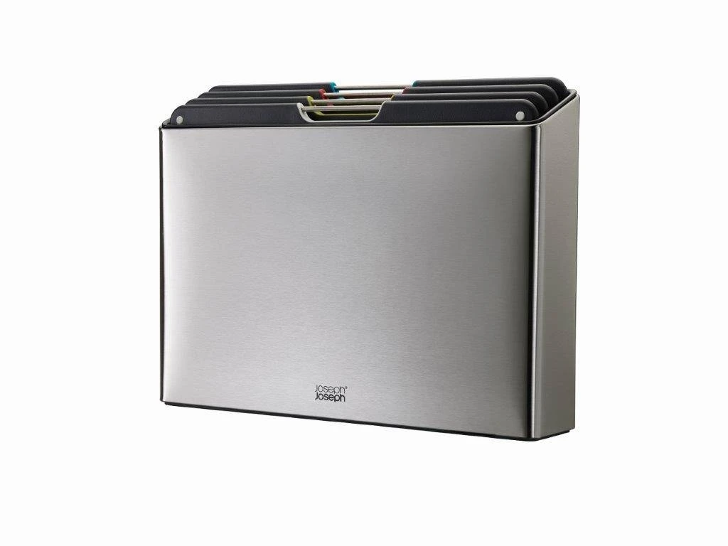 This stunning set features a slimline case that holds four large chopping boards and makes a real statement on your worktop.