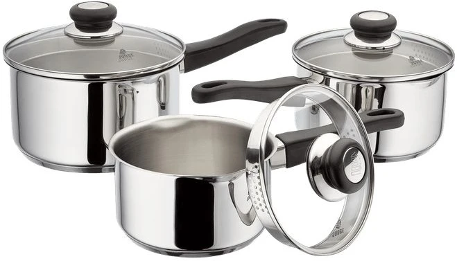 - Set includes:Â 16cm, 18cm and 20cm Saucepans with Draining Lids